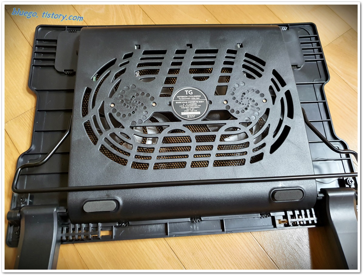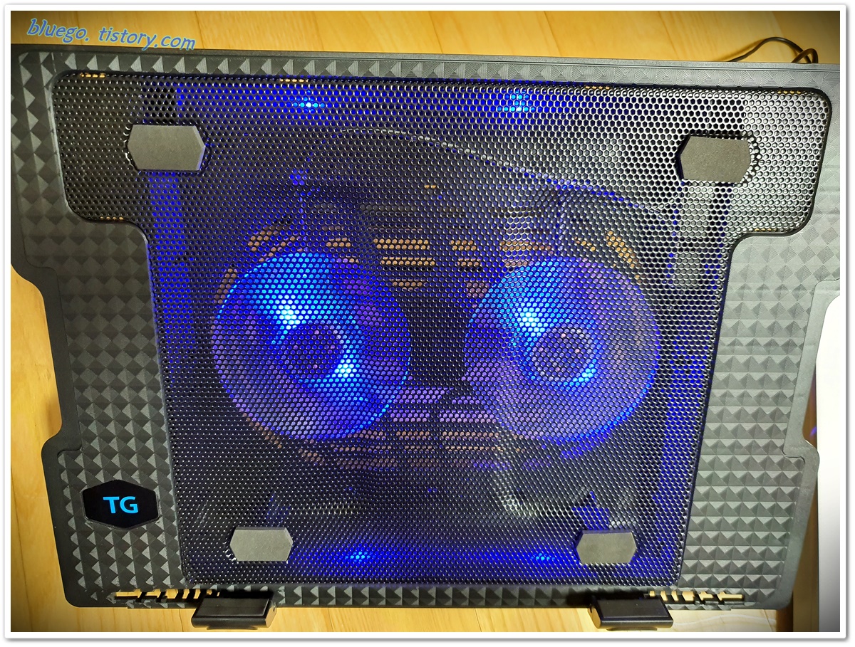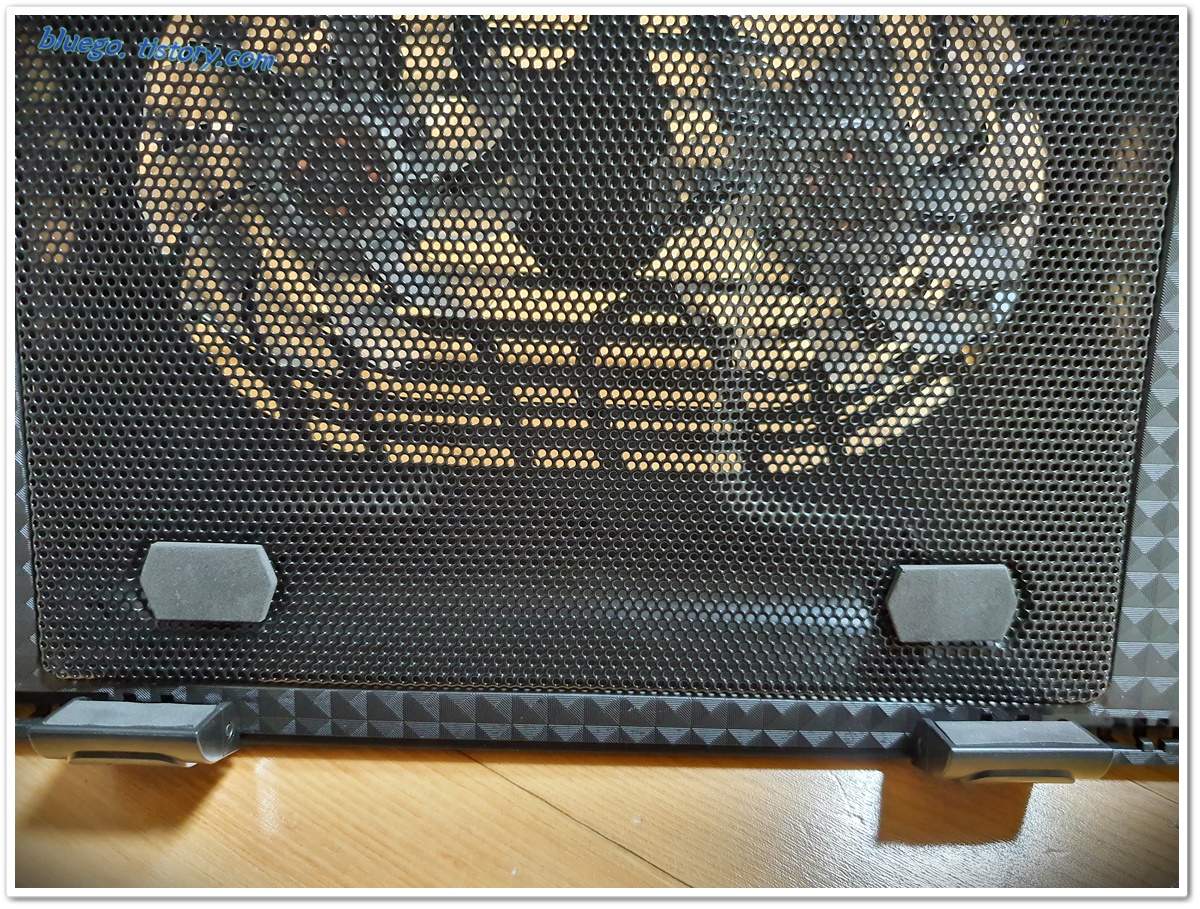 전원을 연결하니 이렇게 파란색 led가 켜졌습니다. 그런데 실제 사용시에는 별로 의미는 없어요. 노트북에 가려서 하나도 안보인답니다. 팬이 두개나 달려있는데 돌아가는 소음은 거의 들리지 않더라구요. 그리고 바람도 느껴질만큼 나오더라구요. 그래서 여름이나 게임할때 발열이 많은 노트북에는 도움이 될 수 있을 것 같습니다. 다만 usb 전원을 사용하고 별도 전원입력이 없어서 노트북에 전원을 연결하고 사용하는게 좋을 것 같습니다.