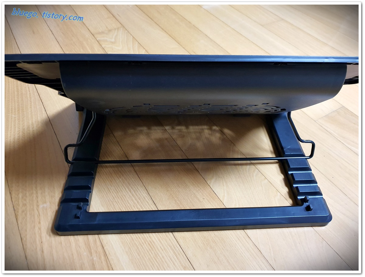 쿨링패드를 옆에서 본 모습입니다. 보시다시피 각도조절을 할 수 있는 홈이 보이실거에요. 옛날 독서대 사용해보신 분들은 금방 파악이 되실 것 같네요. 그리고 지지대가 막상 부실해 보이는데 실제 사용시 문제되지는 않았습니다 요즘 노트북이 가볍기 때문에 큰 문제가 없을 것 같네요