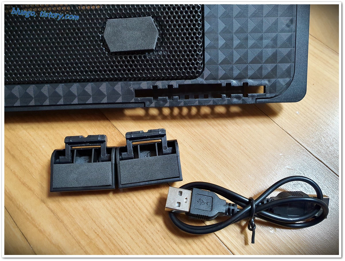 구성품은 아주 간단합니다. 쿨링패드 본체 1개와 usb 전원 연결선 그리고 노트북을 받쳐주는 두개의 받침대입니다. 저걸 패드의 홈에 끼워주셔야 노트북을 거치할 수 있습니다. 절대 버리시면 안되요