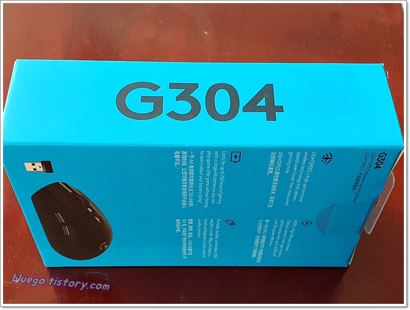 뒷면을 보니 logitech G304 제품특징이 잘 설명되어 있습니다. 무선 게이밍 마우스 답게 속도가 아주 빠릅니다. 라이트스피드 기술이라고 하는데 유선보다도 빠를 수 있다고 자랑하고 있네요 속도는 1m/s 입니다. 또 광학 센서도 hero 센서로 아주 정확하고 효율적이라고 하네요.