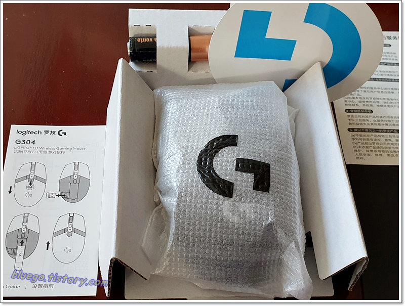 제품을 개봉해보겠습니다. 간단한 설명서. 그리고 마우스가 포장되어 있습니다. 나름 포장에 신경쓴것 같습니다. 그리고 배터리도 하나 들어있네요. 그리고 쓸데 없어 보이는 G 스티커가 들어있습니다. 이건 왜 주는건지 모르겠네요