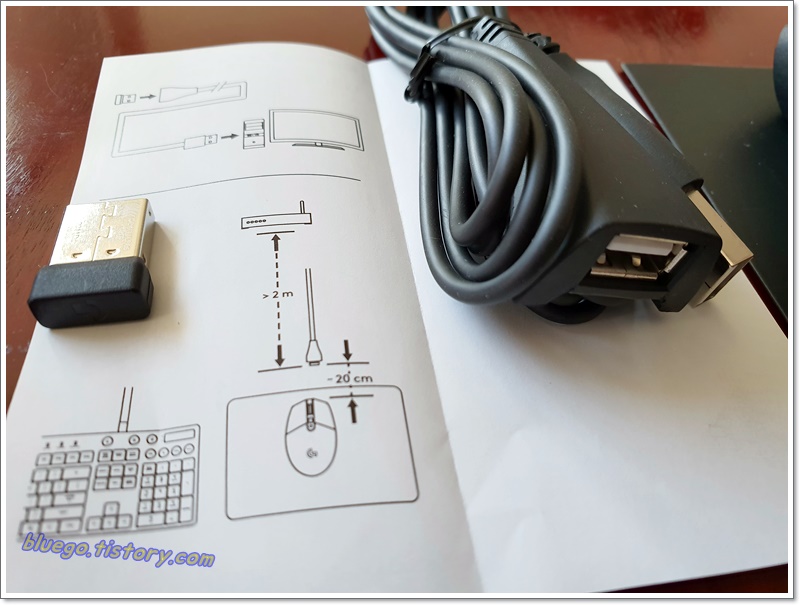 로지텍 G304 마우스에는 부속품이 하나 더 들어있습니다. 바로 usb 연장선인데요. 컴퓨터를 바닥에 두거나 멀리 두고 쓰시는 분들은 이 연장선을 연결해서 마우스 근처에 수신기를 배치하실 수 있습니다. 설명서 보면 20cm가 좋다고 되어 있네요. 또 무선마우스 사용시 공유기랑은 멀리 떨어져 있는게 좋다고 하네요. 아마도 전파 간섭이 일어날 수 있어서 그런 것 같습니다.
