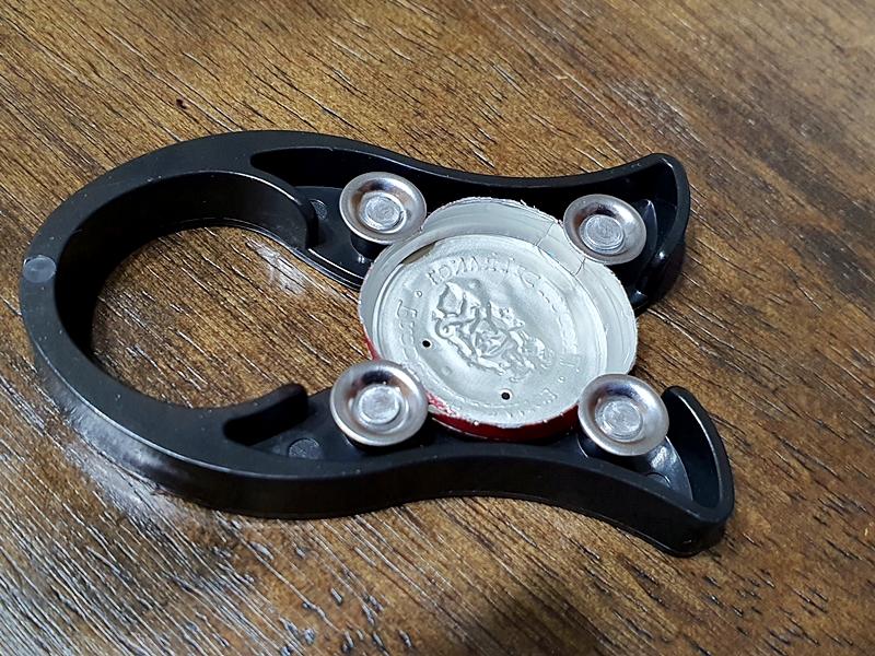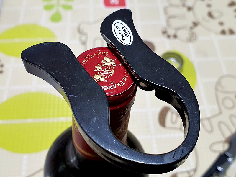 뒤로 돌려보면 이런 모습입니다. 4개의 날카로운 원반이 보이시나요? 바로 이걸로 호일을 잘라주는건데요. 이 호일리무버를 사용할 때 주의할점은 이걸 막 벌려서 억지로 병에 끼우려고 하시면 안된다는 겁니다. 그럼 바로 목이 뎅강 하고 리무버가 사망하는 경우가 있어요