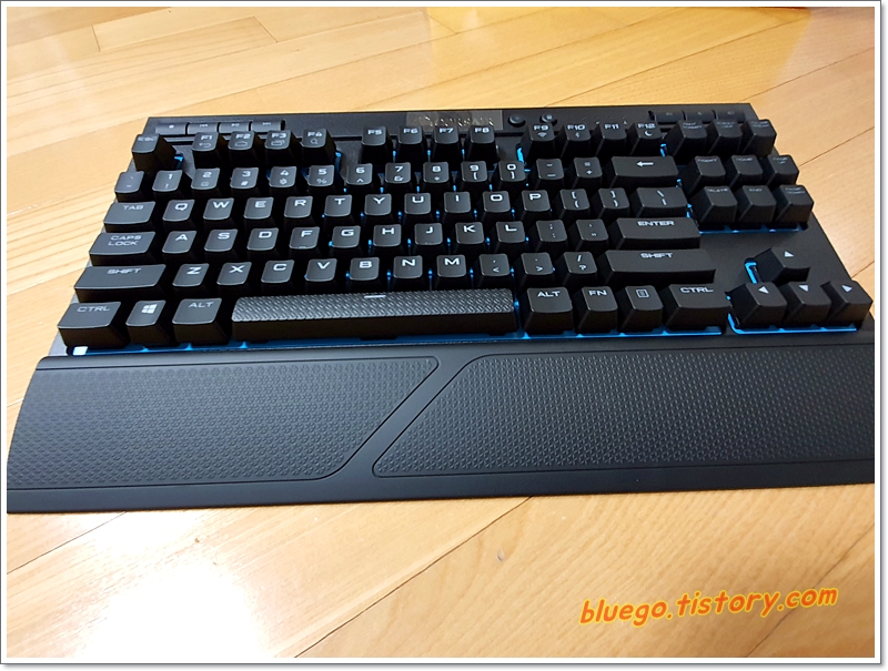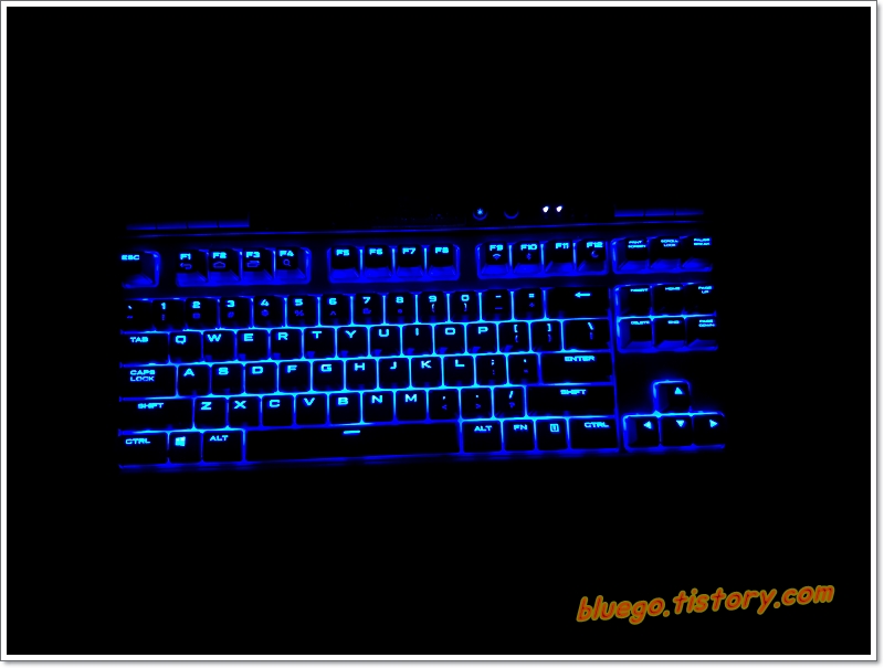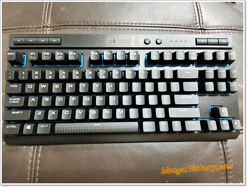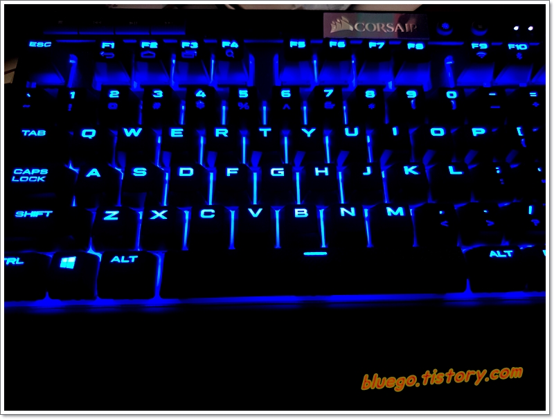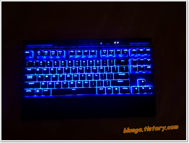 위 사진은 키보드를 컴퓨터에 연결한 모습이랍니다. led가 들어오니 더 멋있네요. 그런데 겨울엔 좀 추울 것 같은 색상입니다. 이 제품은 다른 커세어 제품과 다르게 led 색이 단일색입니다. 어떤 모델들은 다양한 색상이 가능하던데 그게 아쉽네요 .
