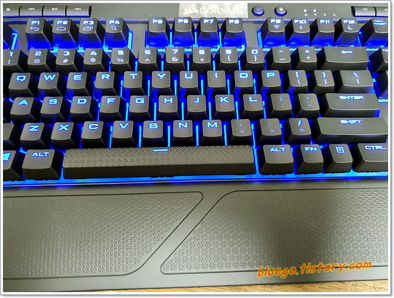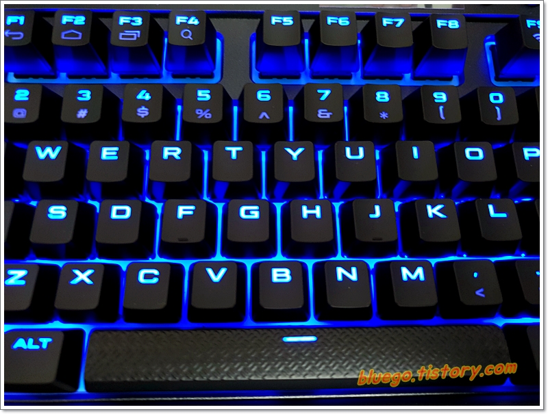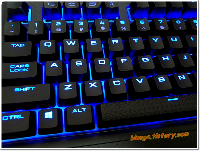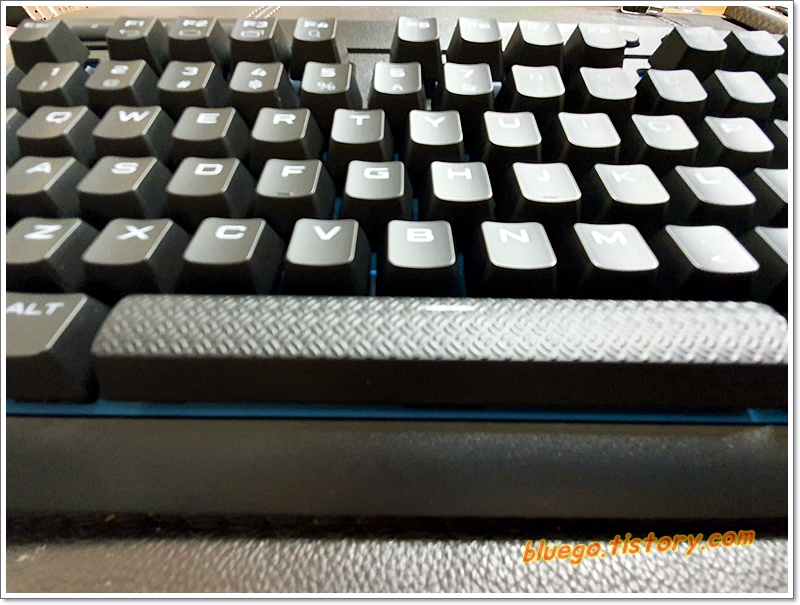 그럼 이제 비닐을 제거한 모습을 감상하시죠. 스페이스바에 이렇게 격자무늬가 들어있습니다. 게임할때 쓰면 안밀릴 것 같이 생겼네요. 그리고 기본적으로 키보드 자판 아래가 푸른색입니다. led가 파란색이라 불켜지면 더 멋지게 색을 배치한 것 같습니다. 그런데 led를 안켜도 불이 켜있는 듯한 느낌도 드네요
