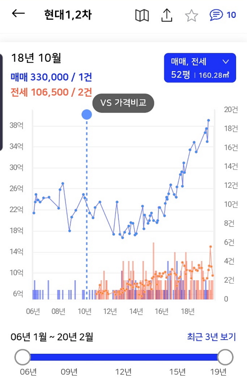 압구정 현대 1차 2차 아파트를 조회해 봤습니다. 그러면 거래가격과 건수가 이렇게 그래프로 쫙 나옵니다. 아파트 가격이 34억이 넘어버렸네요. 16년도에 비교해보면 엄청난 상승폭을 보실 수 있습니다. 이렇게 그래프로 보니 집 값이 얼마나 올랐는지 드라마틱하게 볼 수 있네요.