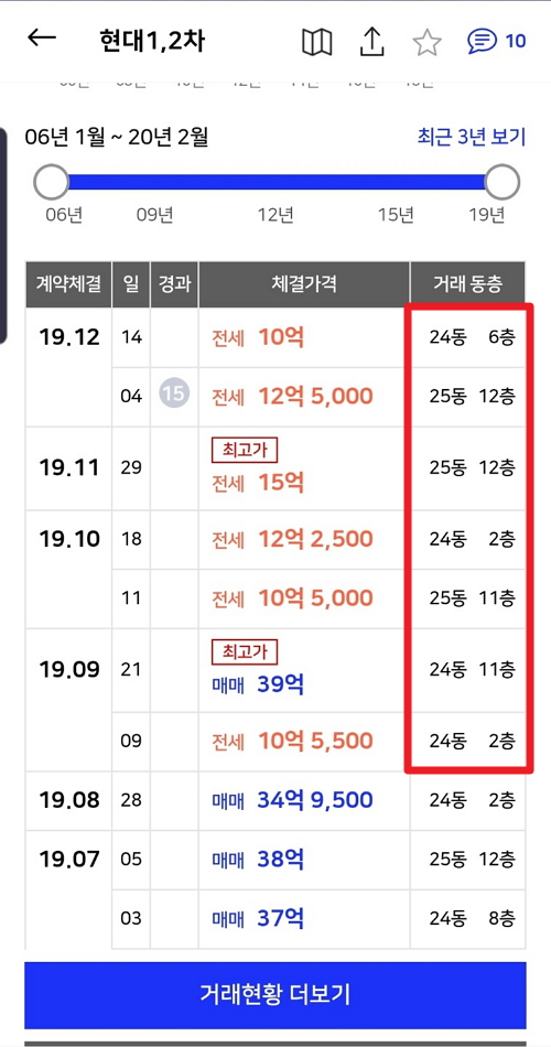 그래프 아래쪽을 보시면 연도별 월별로 실거래 가격이 쭉 나오는데요. 제일 오른쪽 보시면 동이랑 층이 나옵니다. 그러니 정확한 호수는 알 수 없지만 실거래사이트에서 면적 등으로 타입등을 확인하고 여기서 동과 층을 알수 있다면 몇동 몇호인지도 분석이 가능할 것 같네요