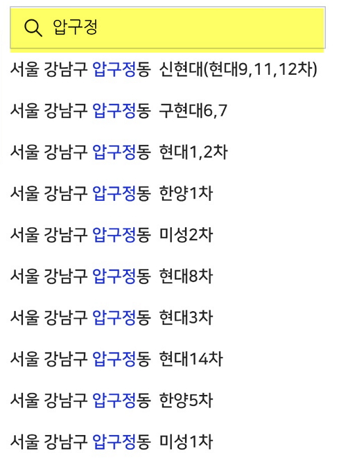 예를 들어 압구정을 검색해 보겠습니다. 압구정 아파트도 비싼 아파트가 많죠? 그럼 이렇게 압구정에 위치한 아파트까 쭉 나오게 됩니다. 참 쉽네요