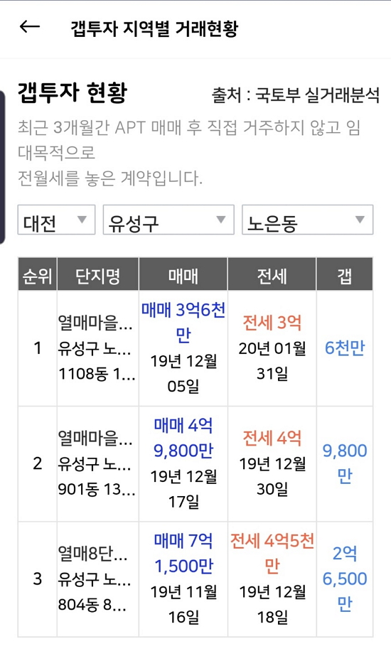 요즘 많이 올랐다는 대전을 볼까요. 유성구 노은동을 들어가보니 최근 일어난 갭투자 내역이 보입니다. 매매가와 전세가를 확인할 수 있고 그럼 당연히 갭이 얼마인지가 나옵니다. 이제 아파트별로 얼마나 많은 투자자가 들어갔는지도 알 수 있겠군요.