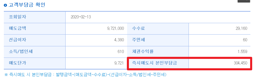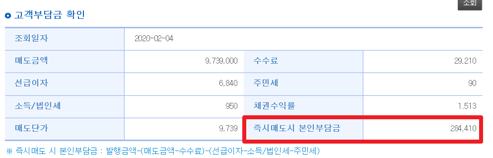그런데 이런 복잡한게 싫으신 분들은 고객부담금을 조회해보시면 됩니다. 즉 내가 채권을 사서 바로 팔았을때 차액.. 즉 내가 내야 할 돈이 얼마인지만 빨리 알아보고 싶다면 이걸 조회해 보시면 됩니다.