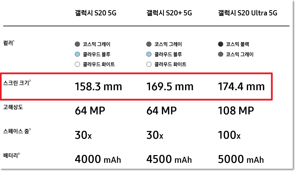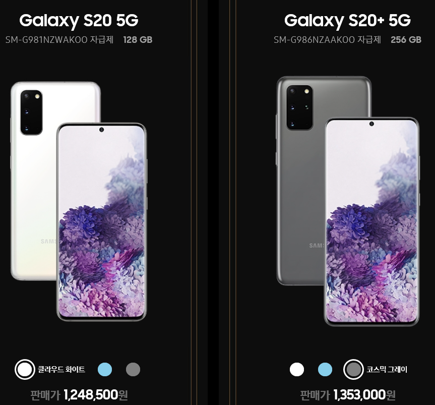 가격을 살펴보니 이렇습니다. 왠만한 노트북 한대 가격이네요. 용량도 노트북 수준입니다. s20과 s20 플러스가 있는데 둘의 큰 차이점은 액정의 크기입니다. 나중에 보시면 알겠지만 배터리도 조금 용량차이가 납니다.
