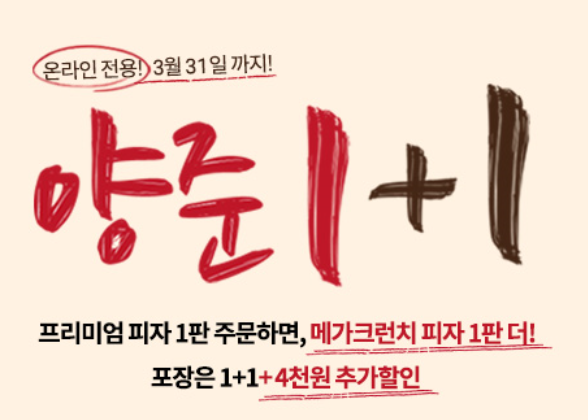 지금 3월까지 행사하는 내용이 1+1 입니다. 그런데 똑같은 피자를 하나씩 더 주는게 아니구요. 메가크런치 피자라는걸 1판 더 준다고 하네요