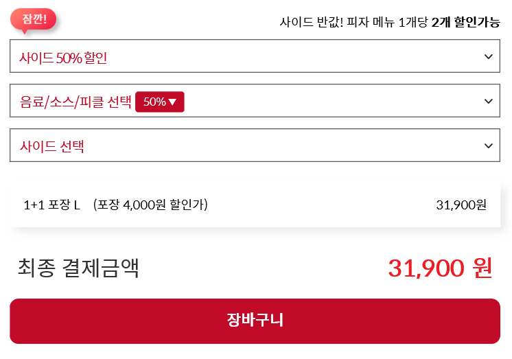 이렇게 주문하고 다른 사이드는 하나도 주문안했어요. 그리고 포장한다고 했을때 4천원 추가할인되어서 31,900원에 결제가 됩니다. 음 두판에 이 정도면 나쁘진 않을 것 같은데.. 메가크런치가 어떤피자일지 궁금하네요