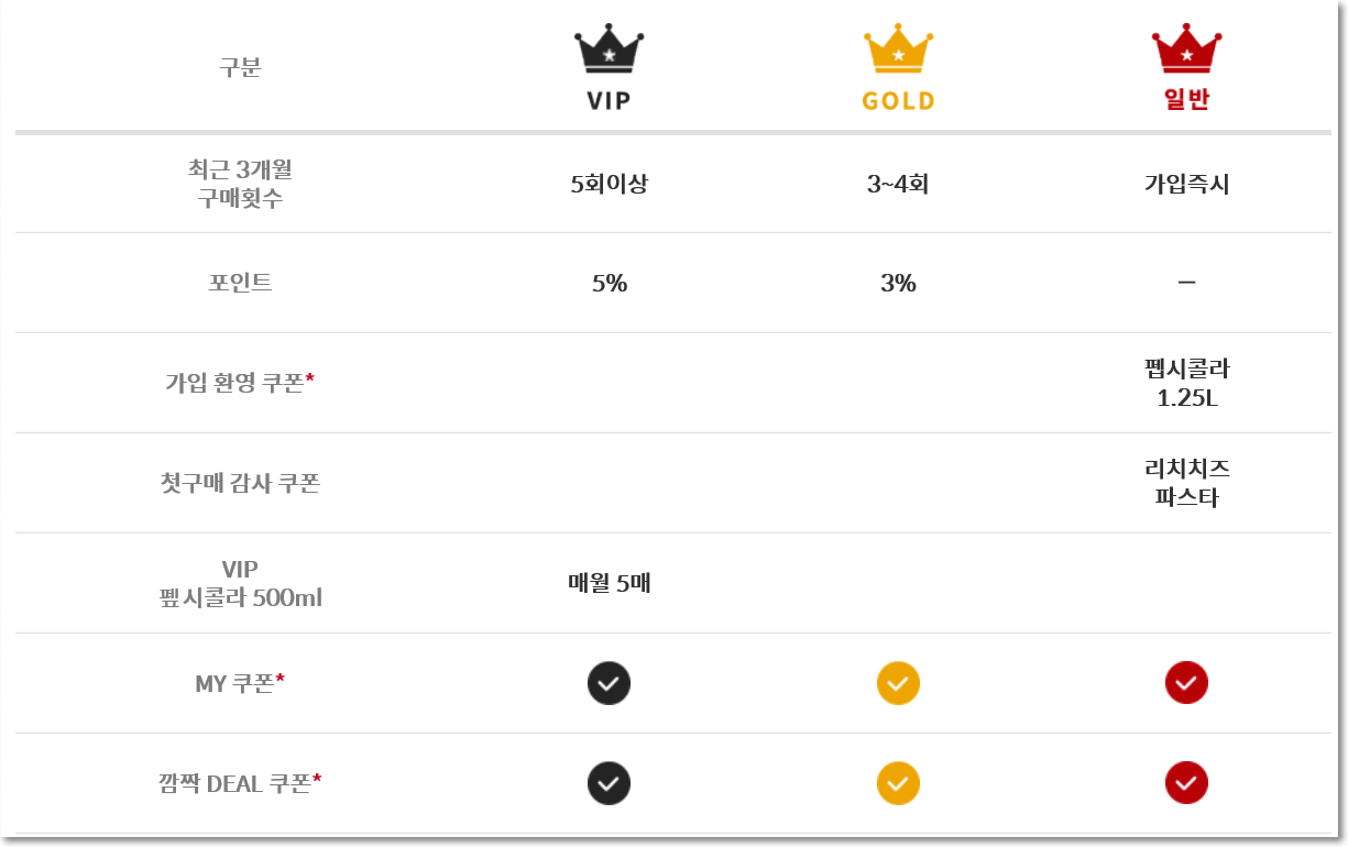 피자헛 멤버쉽은 최근 구매횟수에 따라 결정이 되구요. 포인터 적립률이 차이가 납니다. 그리고 쿠폰을 주는 혜택이 있답니다. 가입안하신 분들은 첫구매시 파스타와 콜라를 무료로 받으실 수 있으니 사용해보세요