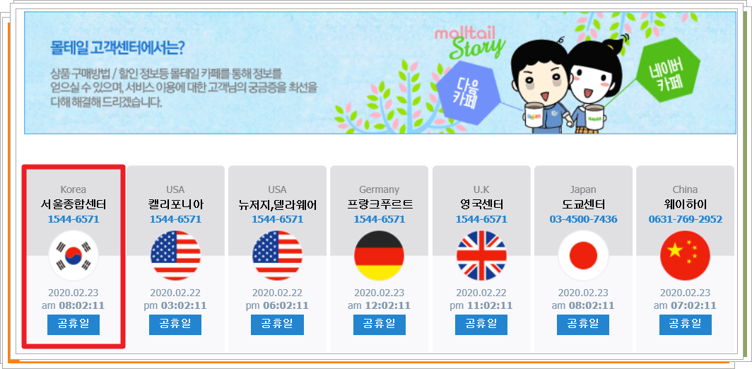 몰테일에서는 미국 뿐만 아니라 독일 영국 일본 중국까지 직구를 지원하고 있습니다. 배대지라는 서비스를 거의 처음 시작해서 엄청난 규모로 커진 것 같네요. 위 사진에서 보시면 각 지점별로 전화번호가 나와 있습니다.