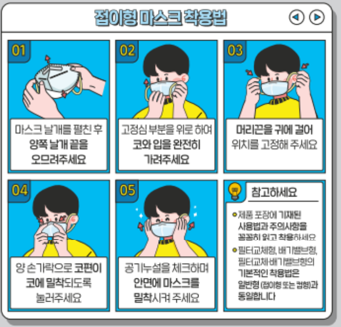 접이형 마스크 착용방법입니다. 요즘 마스크를 사면 두번정도 접혀진 제품이 많더라구요. 안쪽이 오염되지 않게 잘 펴서 코와 입을 가린뒤 끈을 고정하고 코편을 밀착시킵니다. 마스크 보시면 코 부분에 철심같은게 들어있는데 그걸 코편이라고 하나 봅니다. 그런 다음 마스크를 얼굴에서 잘 밀착시키는게 중요합니다.