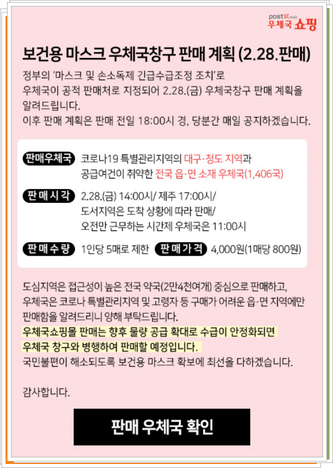 지금 우체국 홈페이지에 공지된 바에 따르면 2월 28일부터 판매가 됩니다. 그런데 인터넷 판매가 아닌것 같습니다. 약국에서는 도시쪽 소비자에게 공급을 하고 우체국은 노약자나 취약층이 많은 읍면 소재 우체국 위주로 판매를 한다고 합니다. 판매시작시간은 14:00시입니다. 오전만 근무하는 작은 우체국은 11시에 판매를 진행하는군요. 1인당 살수 있는 마스크 수량은 5장이고 가격은 1장당 800원입니다. 무척저렴하네요. 마스크 사는거 꼭 성공하면 좋겠네요