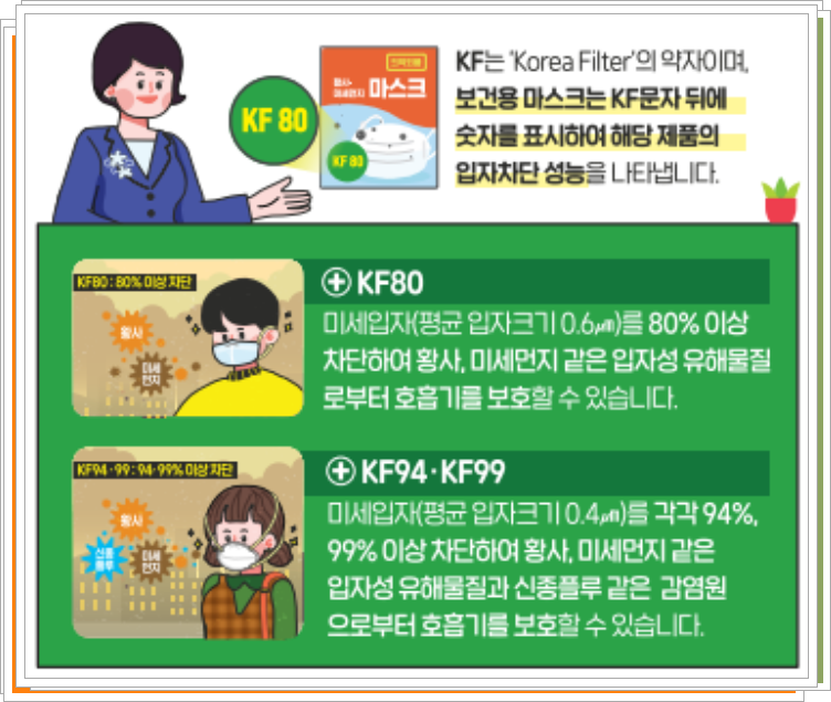 조금 다르게 설명한 자료를 보시면 이해가 조금 쉬울 것 같습니다. KF80은 미세먼지가 0.6마이크로미터인 경우 80%를 차단해줍니다. KF94는 평균입자크기가 더 작은 0.4마이크로미터 입자들은 94% 차단해주는거구요. 그리고 99는 당연히 99%차단이되는거겠죠? 작은 먼지가 차단이 잘 된다는 것은 그만큼 필터가 미세하다는건데요. 그러기 때문에 공기도 잘 안통하는 특징이 있습니다. 그래서 숫자가 높은 방역마스크를 쓰면 호흡이 곤란할 수도 있답니다.