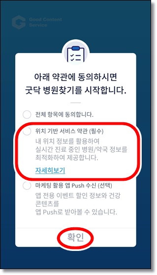 굿닥 앱이 실행되면 이렇게 약관 동의를 해주셔야 합니다. 마케팅 수신이 싫으시면 위치기반 서비스 필수 약관만 동의해 줍니다. 이게 위치 파악이 되야 주변 약국이 검색되므로 위치 동의는 필수입니다.