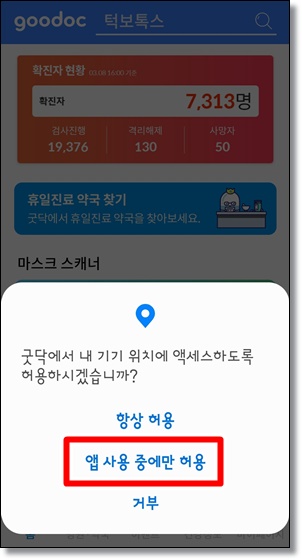 그러면 이렇게 마스크 스캐너 메뉴가 보이실 겁니다. goodoc 앱에는 확진자 동선을 확인하는 기능도 있답니다.