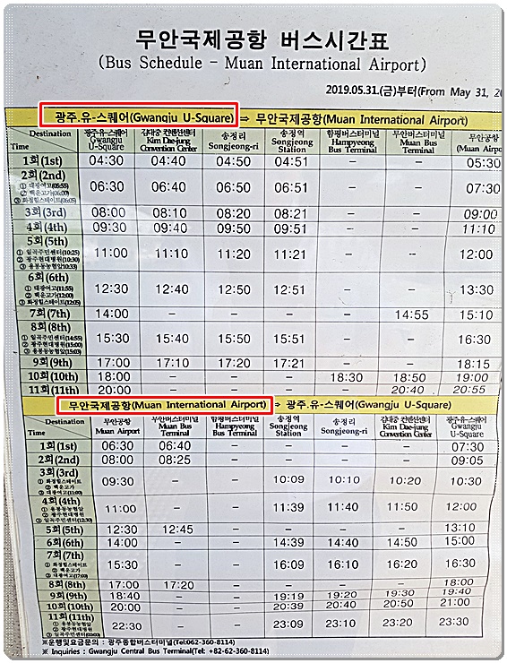 그런데 자가용 이용이 어려우신 분들은 버스를 타야하는데요. 광주 유스퀘어에서 무안공항으로 가는 직행버스가 운영되고 있습니다. 그리고 무안공항에 새벽에 도착하는 비행기를 타는 경우 버스가 없어 불편함을 겪을수도 있으니 꼭 시간표를 확인하시기 바랍니다.