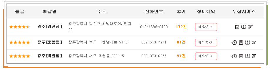 광주에는 검색해보니 세곳이 있습니다. 광산점 운암점, 매월점, 이렇게 세군데입니다. 그러니 주소를 보시고 본인 집에서 가까운곳으로 가시면 될 것 같네요. 그리고 우측에 보시면 정비예약 버튼이 있습니다. 회원가입을 하셔서 예약을 하시고 가면 빠른 시간내에 정비를 받으실 수 있습니다. 예약이 안되어 있으면 토요일같은 주말엔 정말 밀려서 시간이 많이 걸린다고하네요