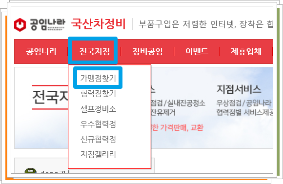 전국지점 메뉴로 들어가시면 가맹점과 협력점을 검색하실 수 있습니다. 먼저 가맹점찾기로 들어가보시기 바랍니다.