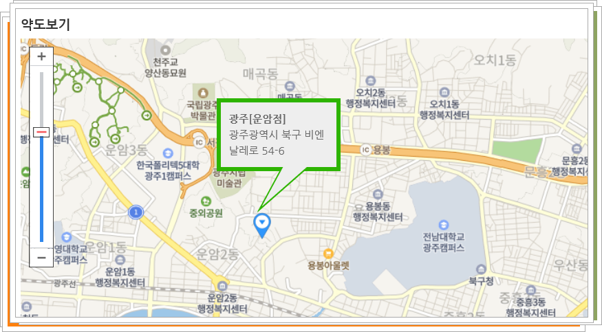 상세페이지에는 이렇게 지도로 가맹점 위치를 알려주니 더 찾기 쉬운것 같습니다. 운암점은 전남대학교 인근에 위치하고 있네요