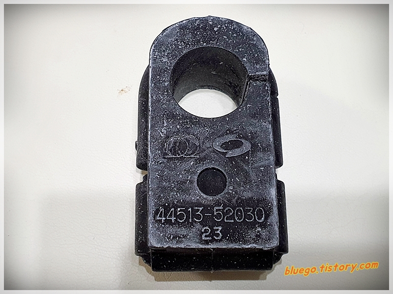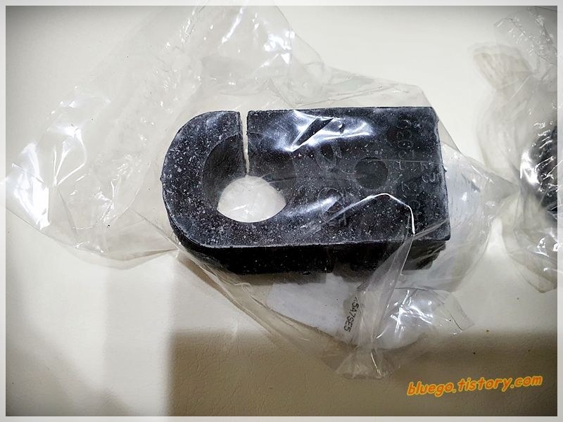 요건 부시(부싱)고무라고 하는 부품입니다. 이것도 차에 총 4개가 들어갑니다. 활대링크와 마찬가지로 앞바퀴쪽과 뒤쪽 모양이 다릅니다. 위 사진에서 보시는 제품이 앞바퀴용입니다. 보통 하부소음으로 활대링크 교체시 같이 교체해주는게 좋다고 합니다. 이 고무가 깨지고 금이가고 그러면 소음이 심하다고 하네요