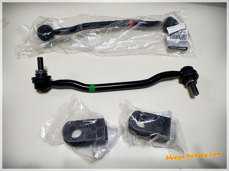 사진 위쪽에 보이는 길쭉한 막대기 모양 두개가 활대링크 부품입니다. 활대링크는 로드 컨넥터 스테빌라이저라고 부르는데요 영어로 rod-connector stabilizer라고 합니다. 제가 구매한 건 전면부 활대링크인데요. 앞바퀴가 두개이듯 이 제품도 좌우 두개가 들어갑니다. 빨간색과 녹색테이프로 구별이 되어 있는데요. 빨간색이 운전석쪽이고 녹색이 조수석쪽 부품입니다. 좌우가 바뀌면 안된다고 하니 잘 체크하셔야 합니다.
