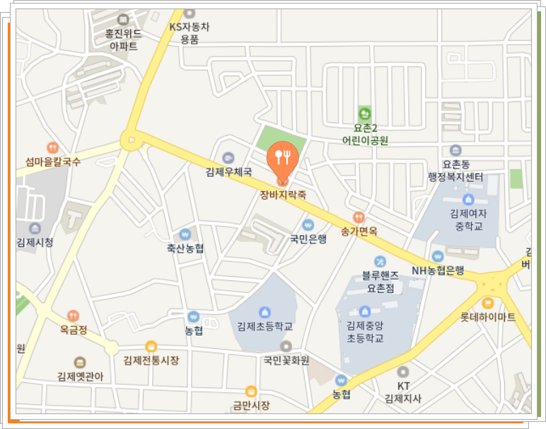 식당 위치는 김제우체국 근방입니다. 건너편에 국민은행도 있고 그러네요. 또 블루핸즈 요촌점도 크게 보입니다. 주변에 김제초등학교, 김제 여자중학교 등 학교도 많네요 위 지도를 보시면 금방 찾으실 수 있을 것 같습니다.