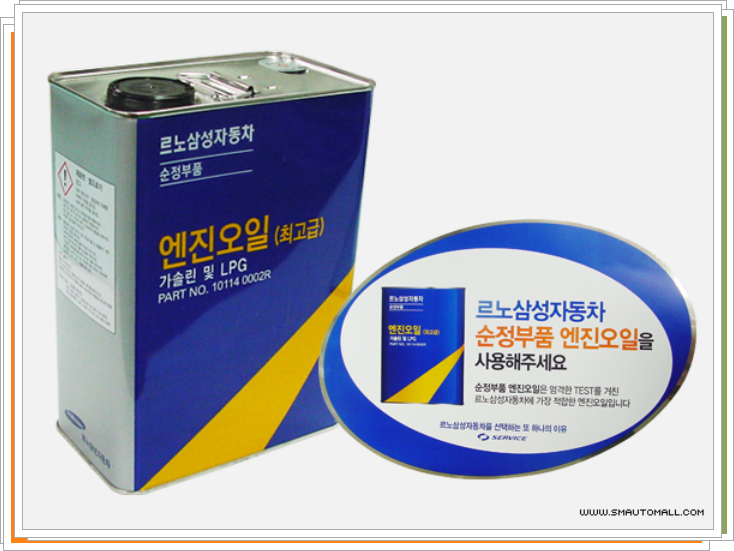 르노삼성자동차 순정오일입니다. 최고급 엔진오일이라고 적혀있어요. 가솔린과 LPG는 동일한 제품을 사용합니다. 그러니 잘 확인하시고 구매하세요. 순정오일은 합성오일보다 훨씬 저렴합니다. 공임 1.5~2만원정도면 교체를 할수있으니 5-6만원 내외면 충분히 엔진오일 교체비용이 됩니다.