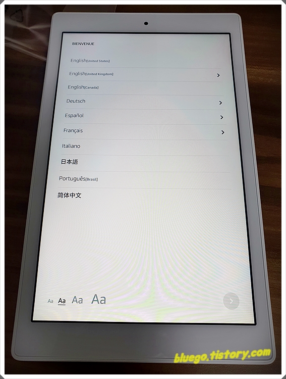 아마존 파이어 hd 10 제품의 단점 중 하나입니다. 전원을 켜봤는데요. 언어설정중에 한국어가 없습니다. 이건 추후에 다른 방법으로 한글을 사용할 수 있습니다. 키보드도 한글키보드를 설치할 수 있고 안드로이드 태블릿처럼 쓰기위해서 구글 플레이스토어도 설치하시면 됩니다.
