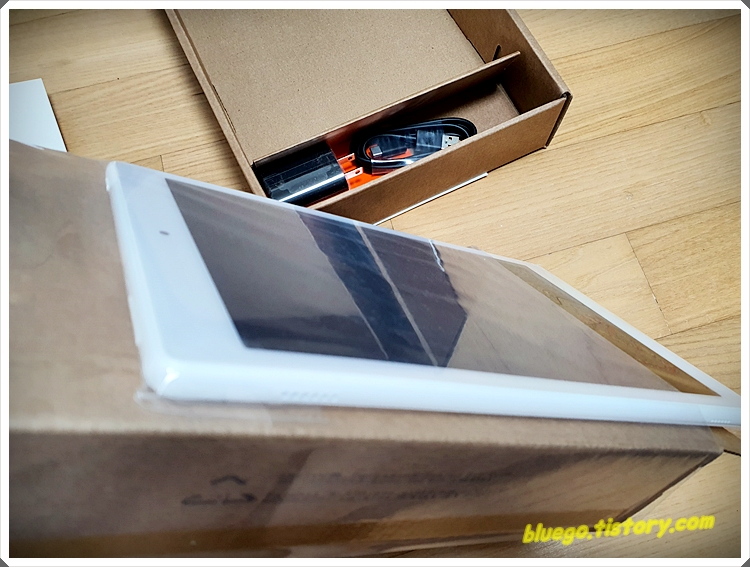 박스를 열어보니 특이한 포장법입니다. 태블릿이 둥 떠 있는데 아래 상장에 비닐팩으로 꽉 끼어지 상태로 들어가 있습니다. 흔들리지 않도록 이렇게 포장을 한 것 같은데 나름 머리 쓴 것 같네요. 그리고 태블릿 자체에 또 비닐포장이 씌워져 있습니다.
