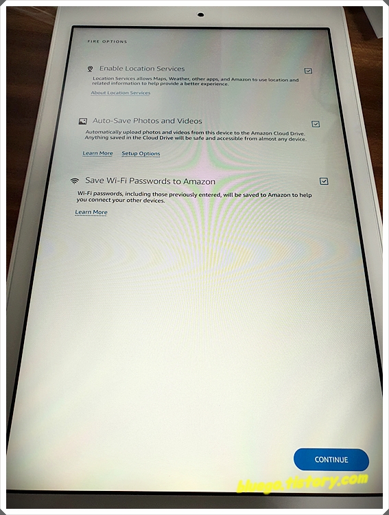 그런데 나중에 확인해보니 여기서 아마존 계정을 등록하면 대기화면 등에 광고가 노출된다고 하네요. 보니 아마존 관련 제품들을 광고하는건데요. 와이파이 등록하고 계정등록하는 이 과정에서 취소를 하고 진행하면 아마존에 연결이 안되서 광고가 안뜬다고 하니 필요하신 분들은 찾아보시고 진행하시기 바랍니다. 저는 그냥 등록했습니다.