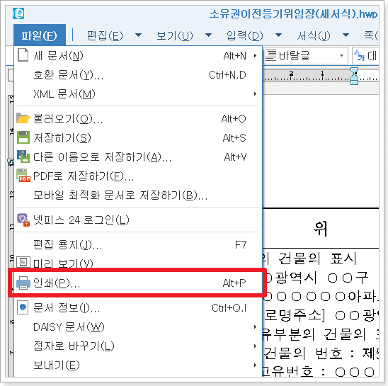 문서 인쇄 메뉴도 파일 메뉴 아래쪽에 있습니다. 인쇄를 눌러보세요