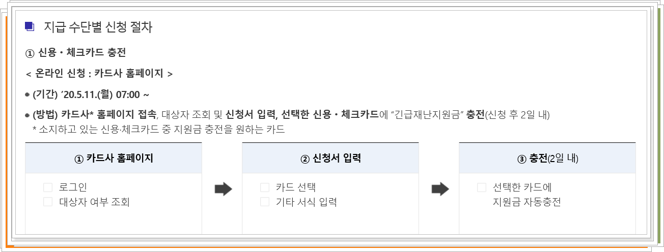 위에서 조회한거는 말 그대로 조회만 한 결과입니다. 조회만 한 것이지 지원금 신청을 하신게 아니에요. 긴급재난지원금 신청일은 카드부터 11일에 시작합니다. 신용카드나 체크카드에 신청을 하셔야 하는데 본인이 사용하는 카드사 홈페이지에서 가능합니다. 월요일이 첫 신청일인데 엄청나게 몰릴 것 같습니다. 조금 여유있게 신청하시길 바랍니다.