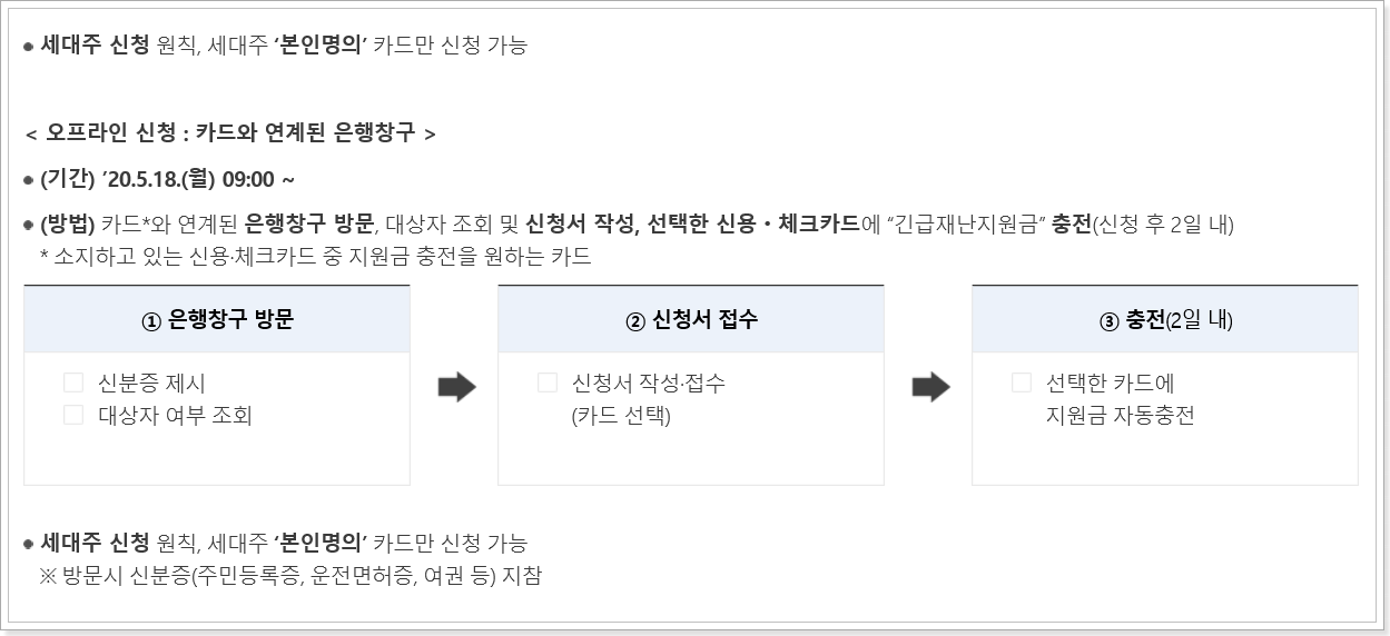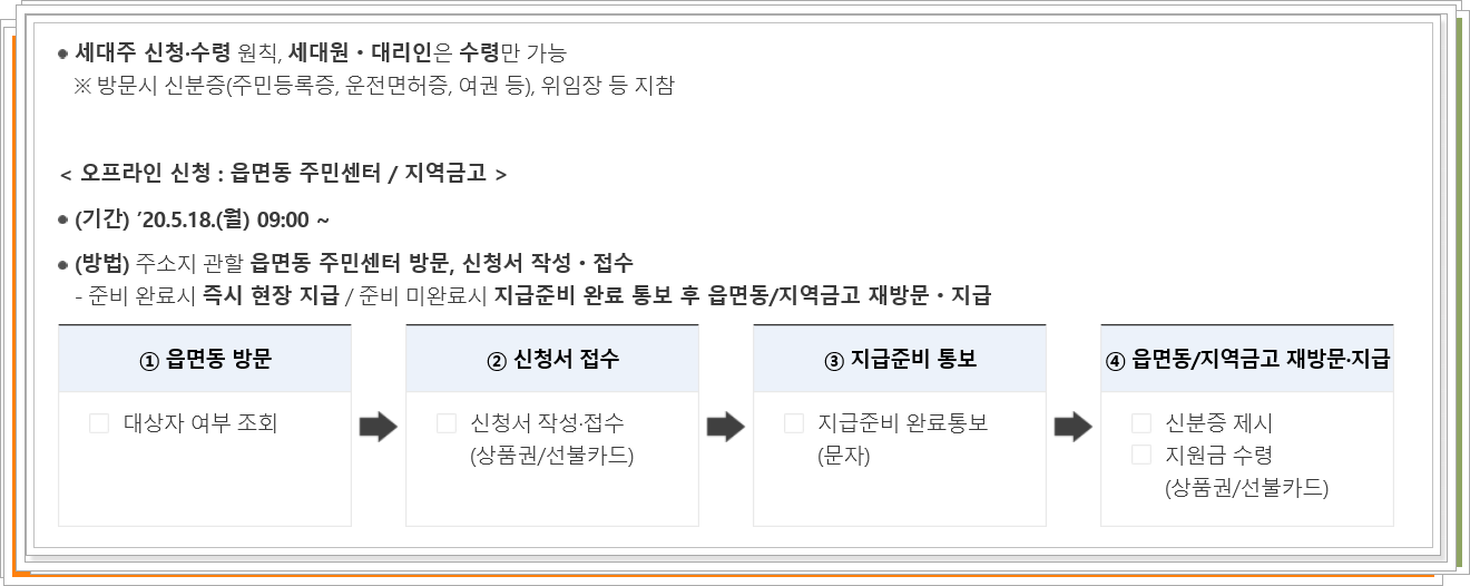 오프라인 즉 주민센터 신청도 5월 18일부터 가능합니다. 지역금고에서도 진행을 하나보네요. 해당 장소를 확인하신후 가셔야 합니다. 이 때도 세대주가 신청해야 합니다. 세대원이나 대리인은 대신 수령은 할 수 있네요. 이때도 방문시 신분증은 필수입니다.