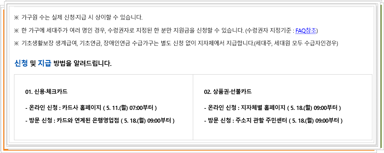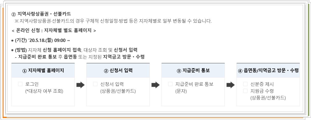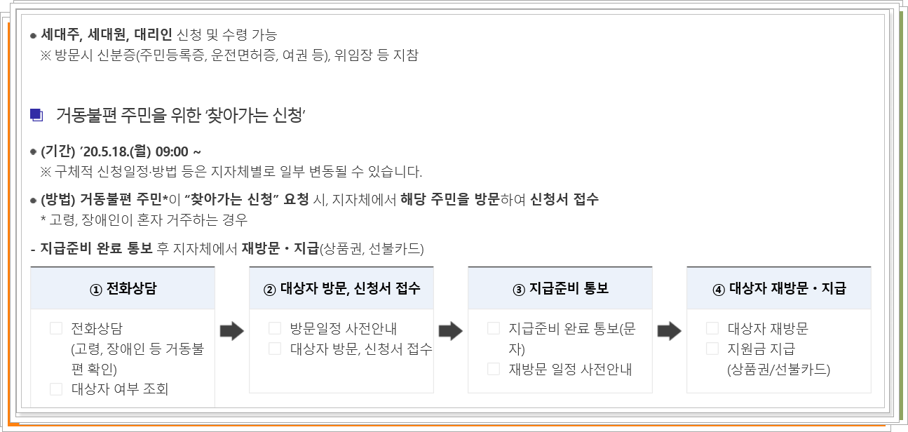 거동불편자를 위해 찾아가는 신청 서비스도 진행합니다. 5월 18일부터 진행되는데요. 고령자나 장애인 분들이 혼자 거주하시는 경우 직접 찾아가서 신청서를 접수한다고 합니다. 그리고 상품권이나 선불카드가 지급되면 직접 방문하여 지급하구요. 그러니 불편하신 분들은 전화로 꼭 상담하시기 바랍니다.