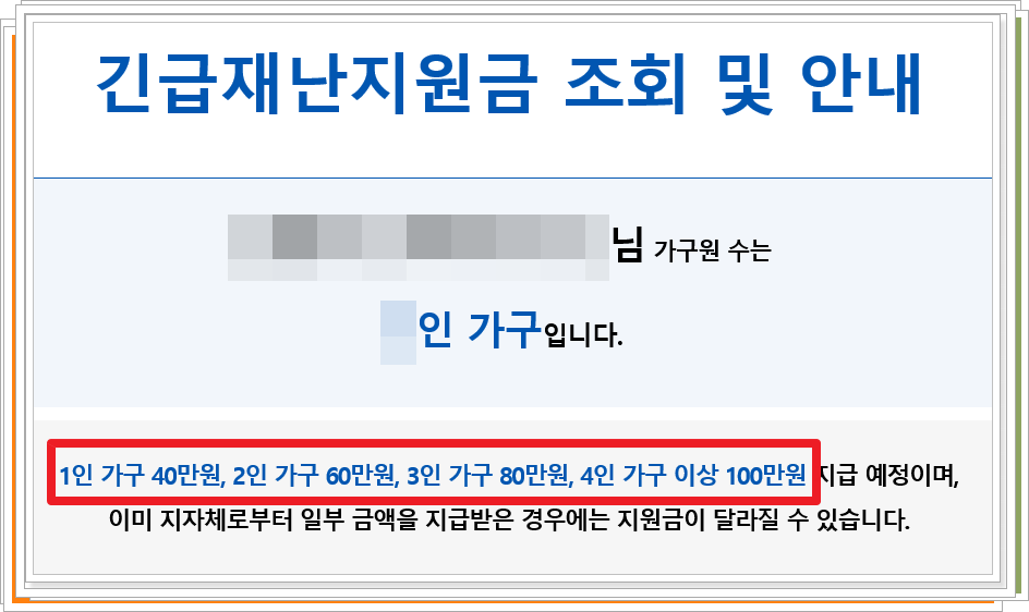 조회를 하면 이렇게 가구원수가 뜹니다. 그럼 가구원수에 따라 지원금이 바로 확인되네요. 4인가구 이상은 100만원입니다. 5명은 120만원 주면 좋겠는데 4명이상 일괄 100만원이라네요 백만원이면 엄청 큰돈인데요. 1인가족도 40만원을 지원받습니다.