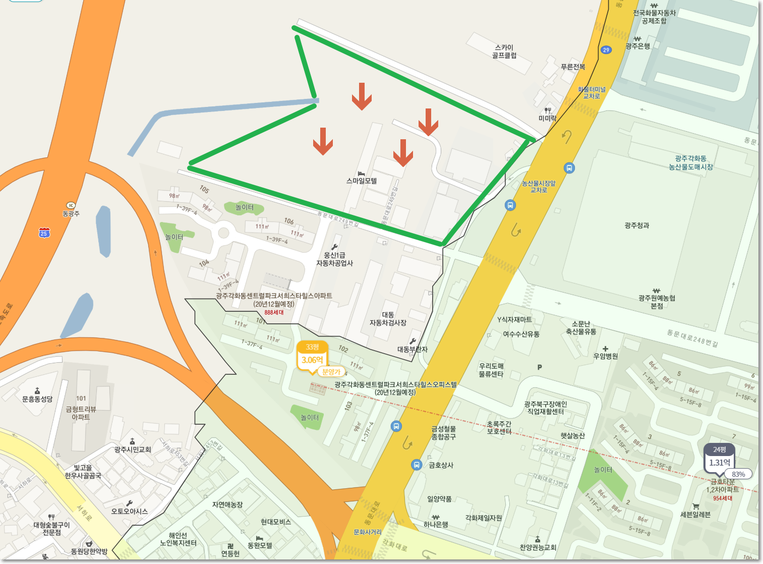각화동이 향후 많은 변화가 있을 것 같습니다. 솔로몬로파크와 민주인권기념파크가 크게 들어올 예정이구요. 농산물도매시장도 이전할 거라는 이야기가 꾸준히 나오고 있습니다. 이쪽은 동광주 ic 가 바로 연결되기 때문에 교통은 아주 편리할 것으로 예상됩니다.