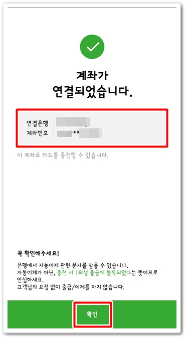 진행이 잘 되었다면 위 그림처럼 연결완료 상태 메시지기 뜹니다. 그리고 핸드폰으로 출금계좌 등록 내용이 날아옵니다. 그럼 이제 충전할 준비가 되신겁니다. 마이페이지에 가서 카드에 충전을 누르시고 금액을 누르시면 본인 계좌에서 자동으로 청주페이로 이체가 된답니다.