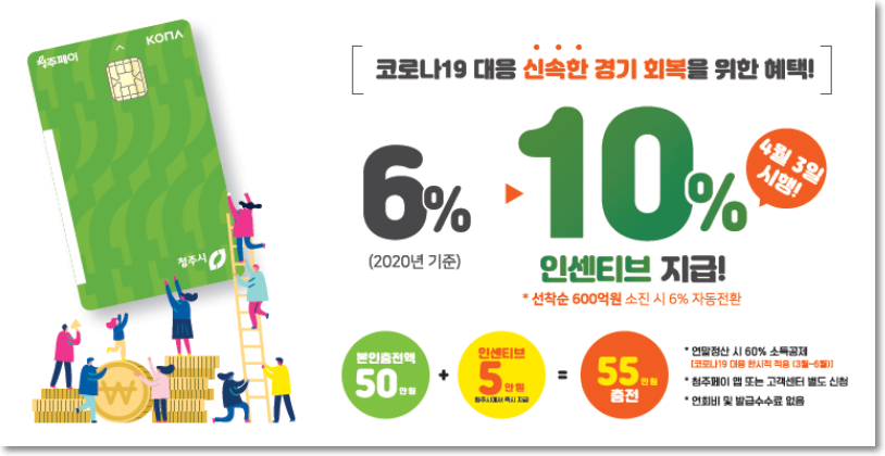 오늘은 이전 포스팅에서 알아본 청주페이 관련된 내용입니다. 청주페이는 청주시에서 발행한 지역화폐라고 보시면 되는데요. 50만원 충전시 5만원 인센티브가 지급됩니다. 그러니 일반 상점에서 사용시 10퍼센트 할인되는 효과가 있습니다.