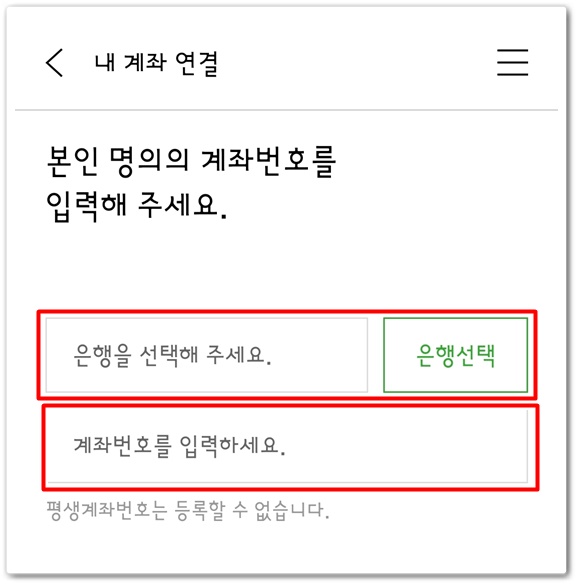 계좌연결 버튼을 누르면 위 화면처럼 입력창이 나옵니다. 본인이 주로 사용하시는 은행과 계좌번호를 선택해서 등록을 진행하세요