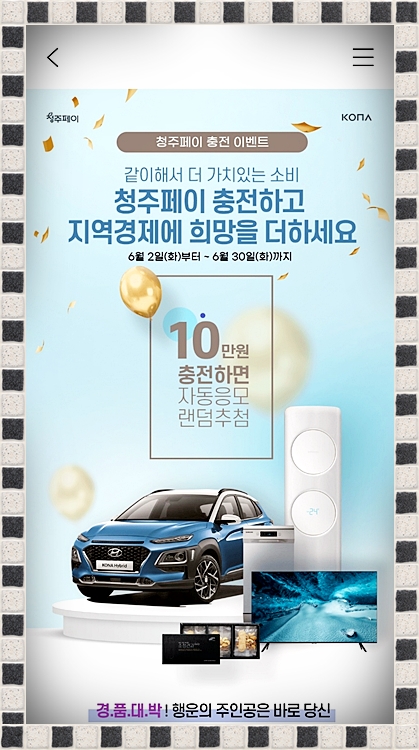 지금 이벤트도 실시하고 있습니다. 이 것 때문에 정책지원금이 많이 줄어들었나 싶네요. 지금 청주페이에 10만원 충전을 하면 한번 충전시마다 자동응모가 되고 추첨을 통해 선물을 주는 행사를 하고 있답니다.