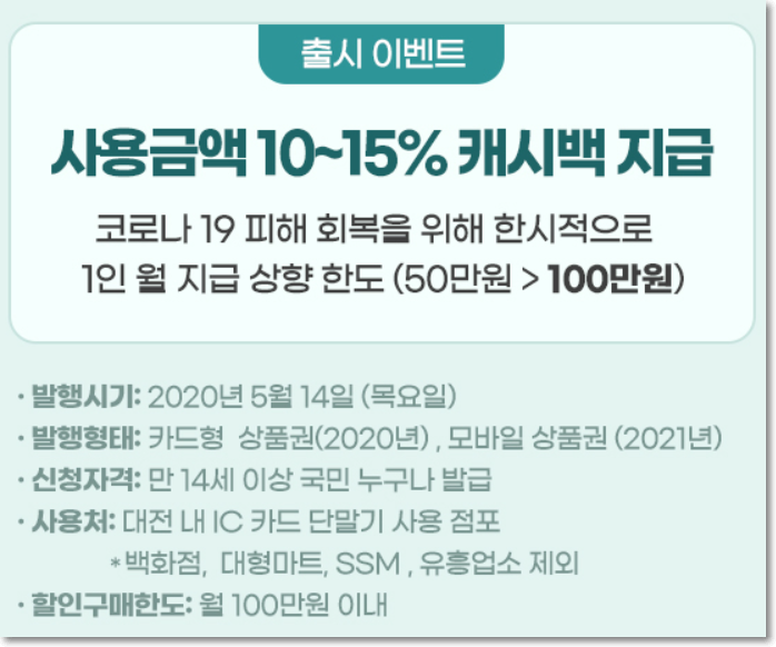 온통대전이 5월에 발행되었는데요. 코로나 19 피해 회복을 위해 1인 월 지급 상향 한도 100만원이 적용되고 있어요. 그리고 최대 10-15% 캐시백이 지급됩니다. 이건 아직도 진행중이니 잘 활용하시기 바랍니다.