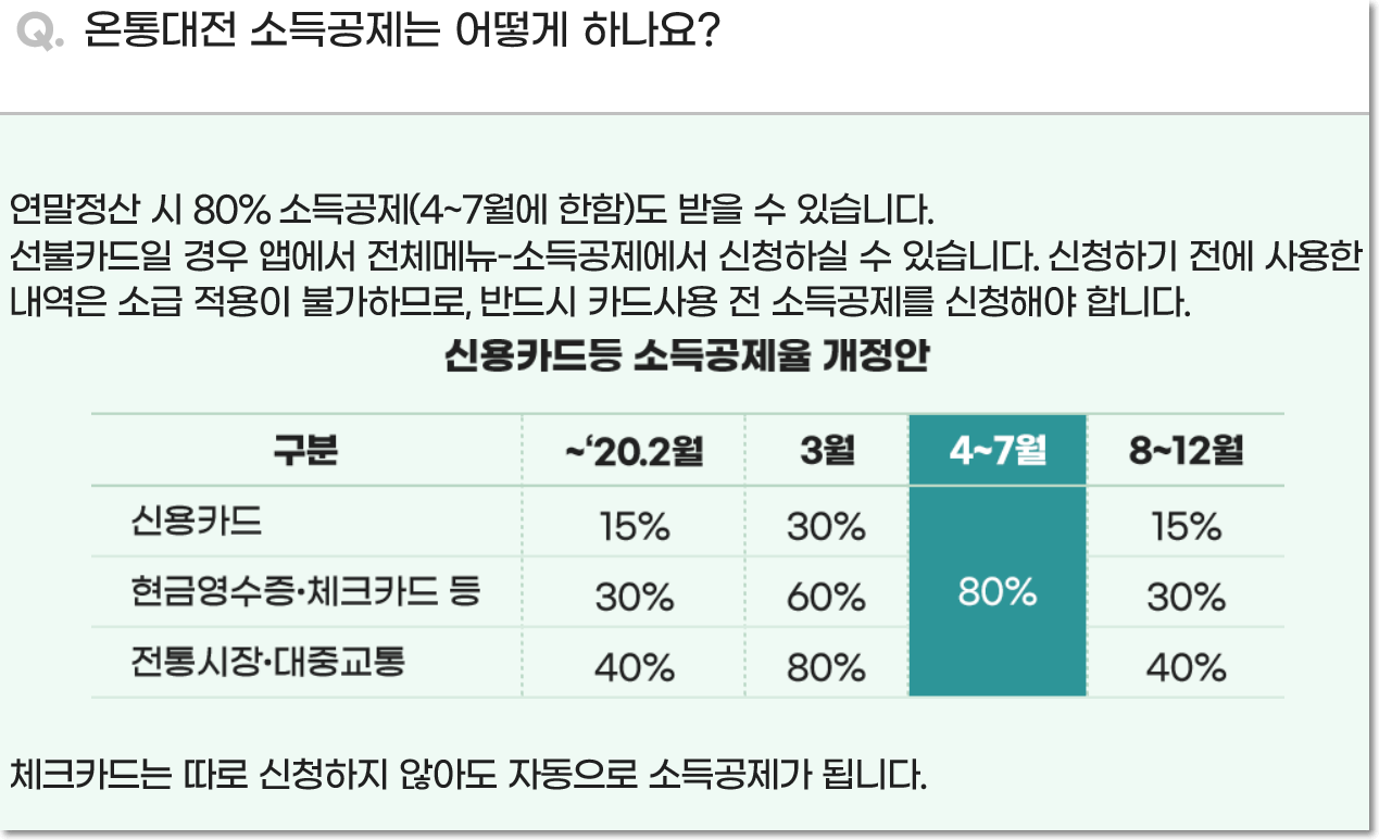온통대전 사용시 소득공제도 가능합니다. 연말정산시 80% 소득공제를 받을 수 있는데요. 4월에서 7월에 한해 적용된다고 합니다. 엄청난 혜택이죠. 그런데 7월 한달만 남아서 돈 쓰실분들은 7월에 모아쓰셔야겠습니다.
