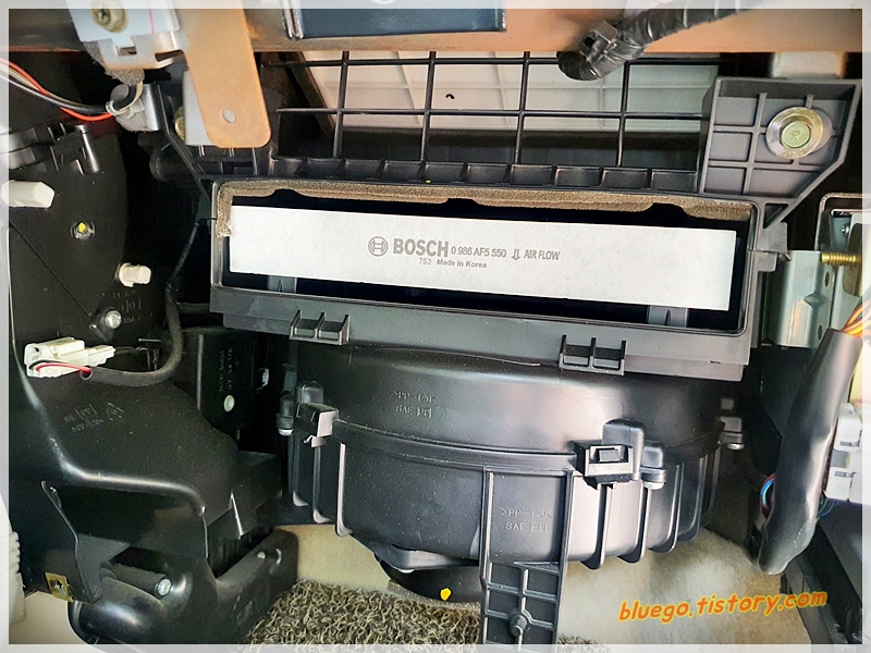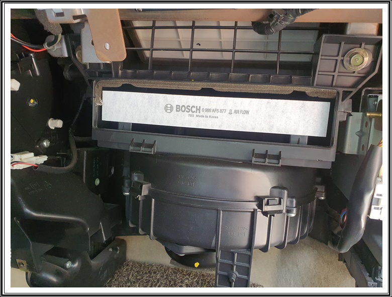 마지막으로 이렇게 새 제품으로 교환하고 뚜껑을 덮어주면 마무리됩니다. 그리고 글로브 박스를 원위치 시켜서 다시 나사를 열심히 조여 주시면 되겠죠? 요게 카센터 가서 하면 귀찮은 작업이라서 그런지 공임도 좀 붙더라구요. 참고하셔서 자가 정비 해보시면 좋을 것 같기도 합니다.