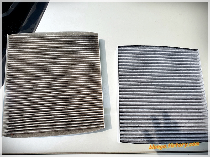 좌측이 예전 필터. 우측이 새 필터입니다. 차이점이 느껴지시나요? 좌측에 먼지가 많이 낀 걸 보실수 있을 건데요. 활성탄 필터가 또 다른 점이 무게 차이가 나더라구요.활성탄 들어간 제품이 확실히 무겁습니다.