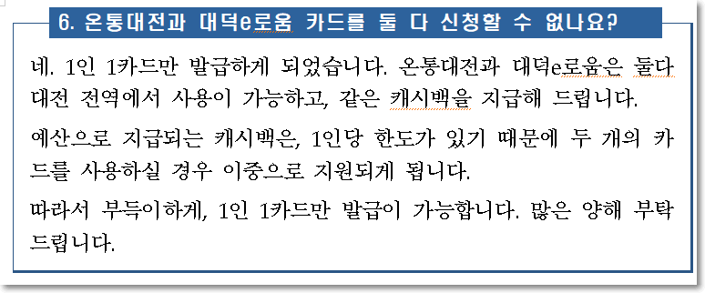 참고로 온통대전을 발급받으면 대덕e로움 카드는 신청을 못합니다. 둘다 똑같은 지원을 받기 때문에 한사람에 하나씩만 사용할 수 있도록 조치를 해 둔 것 같습니다. 참고하시기 바랍니다.